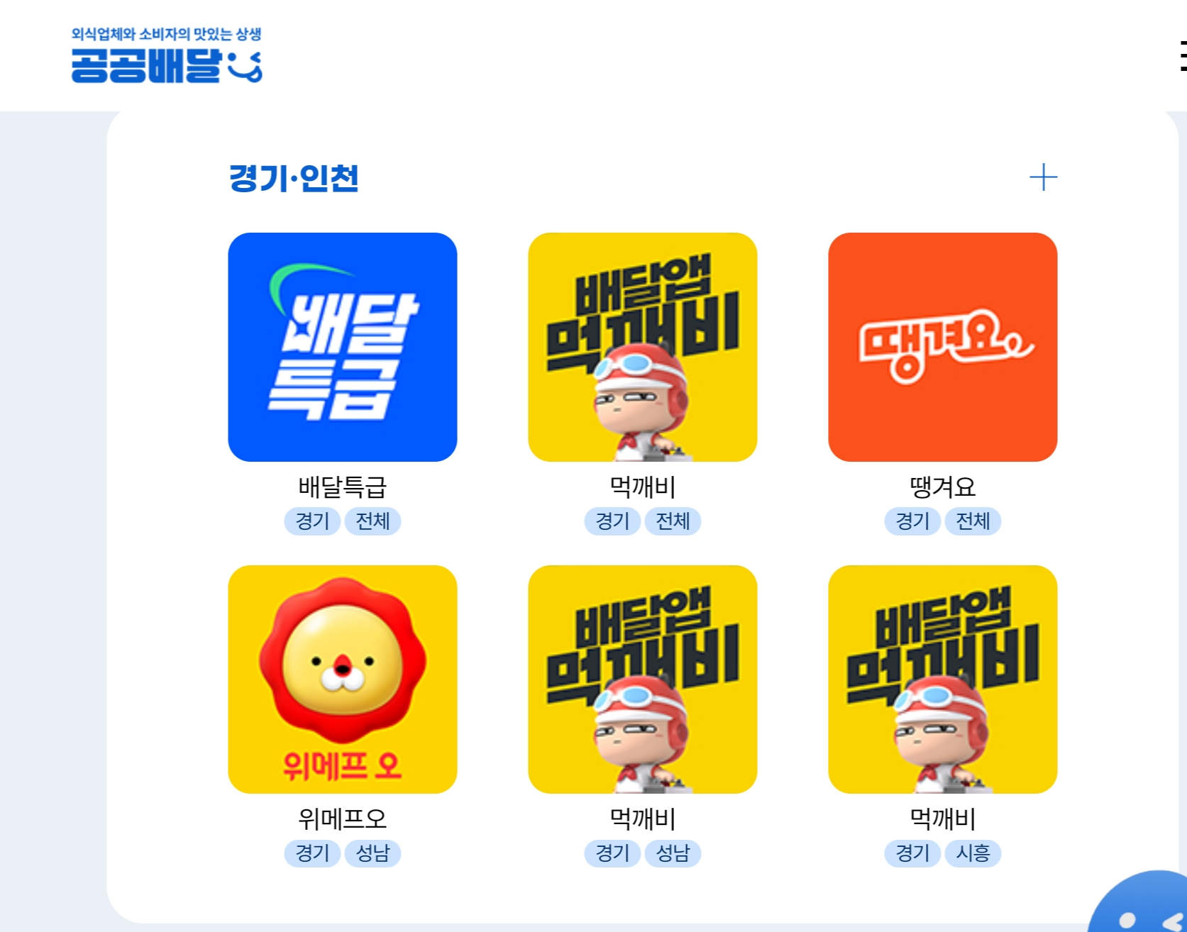 지금 화면은 경기도와 인천광역시가 같이 활성화되어 있네요~~ 이 지역에는 6개 배달앱이 있는 것 같은데요, 화면 아래로 가보면 6개 앱이 떠 있는 것을 확인할 수 있어요~~